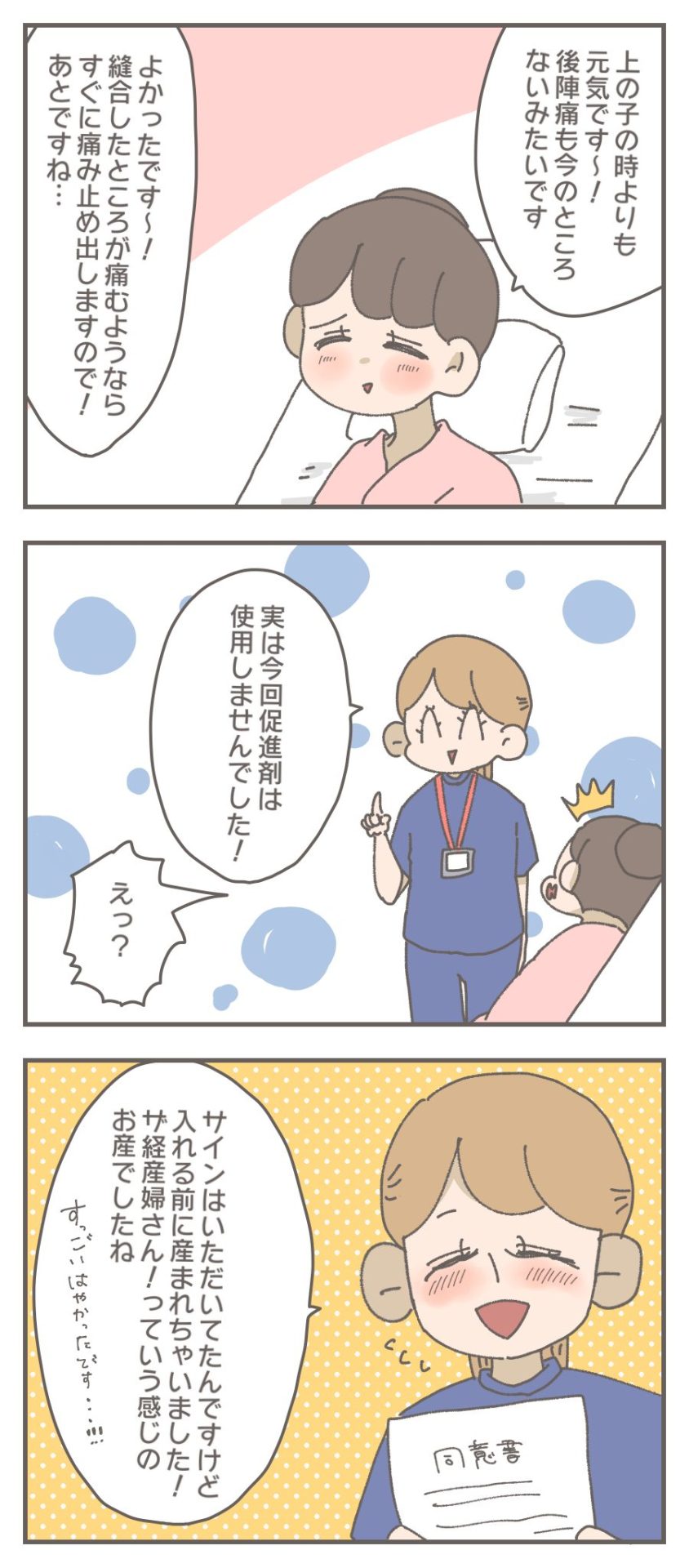 痛みに耐えながら必死にサインした後に突然痛くなったので、促進剤すげぇ〜!って思っていたのですが、なんとあの陣痛は自力でした!(笑)