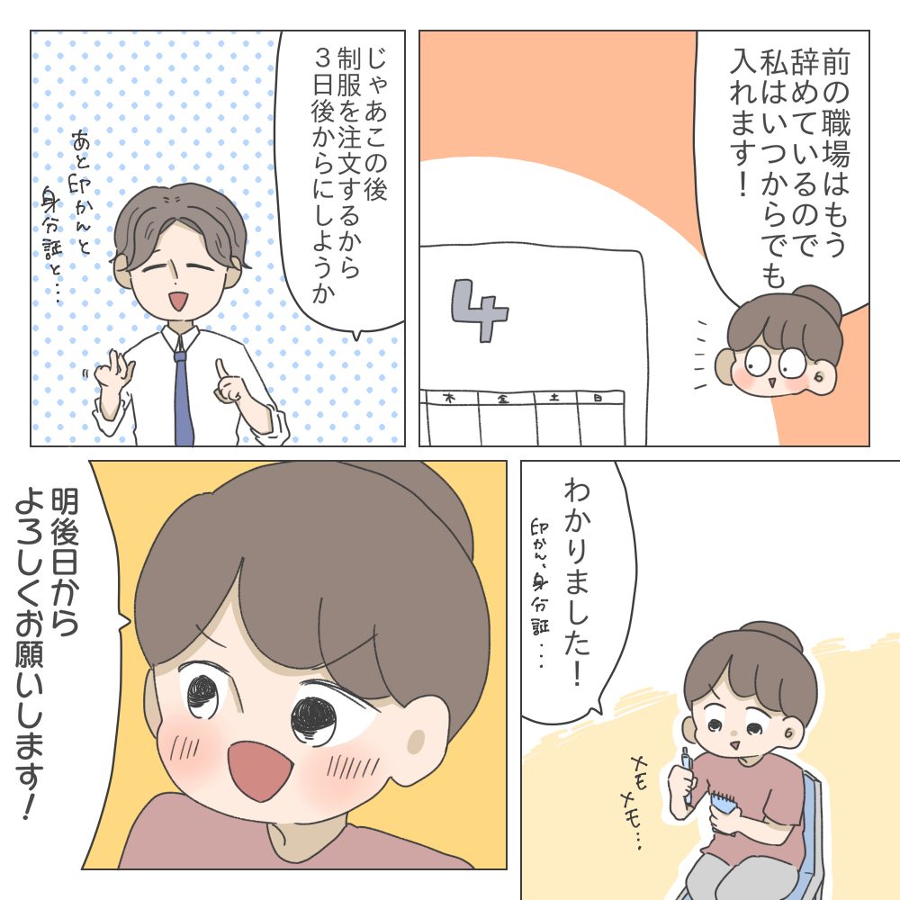 仕事は知ってる(地元でバイトしてたのと同じ全国チェーン)だから新しいことを覚えなくていいし、本当にラッキー!って思ってました。